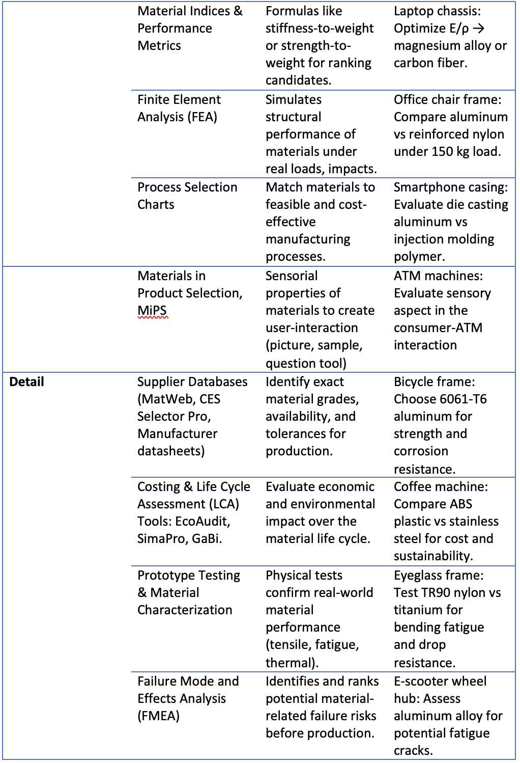 Table 1 summarizes the tools used in the Concept, Embodiment, and Design Detail stages of the product design to assist in material selection. A description of each tool is provided with selected examples.