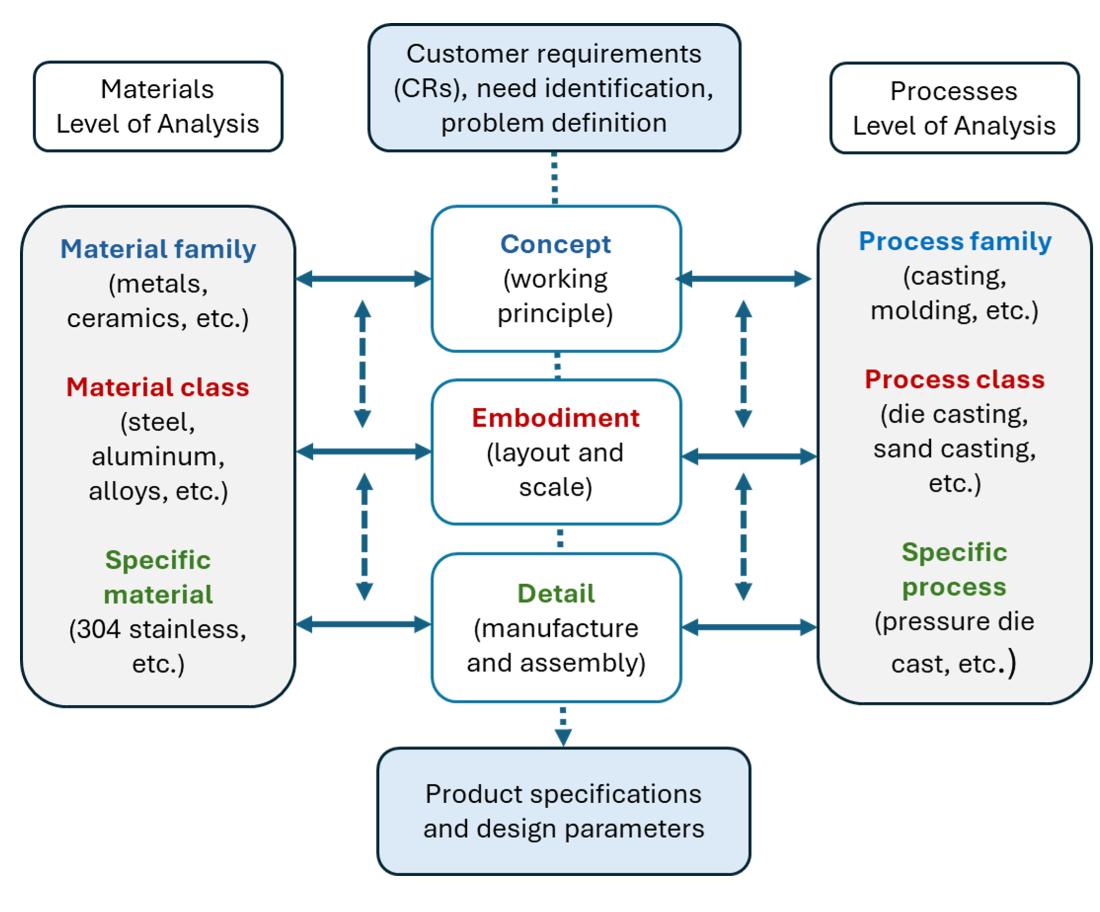 Product and engineering designers adhere to the process outlined in Figure 1. The material selection begins with identifying the material family, then progresses to evaluating the class level, ultimately leading to the selection of a specific material for the design. Concurrently, the process requirements are analyzed, starting from the general family process, moving to the class, and culminating in the final process selection. At each stage, the information regarding materials varies in breadth, precision, and technical specifications.