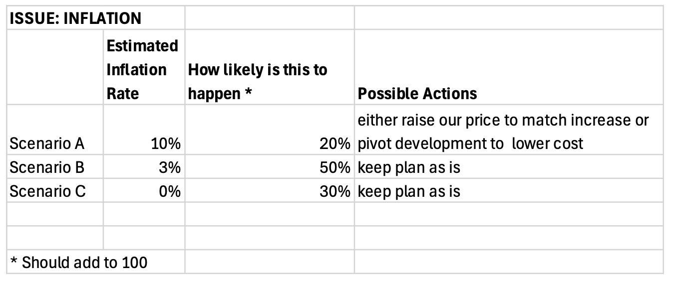 Example: Your biggest issue is possible inflation. You might want to spend the most time estimating the revenue and cost impact of Scenario A. As well as detailing the options if this happens.
