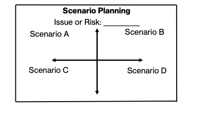 - Create short, detailed scenarios describing possible futures and the impacts they would have on your mission. Then visualize how your organization might pivot within each scenario. With your team, discuss the opportunities and challenges inherent in each scenario. Ask for each: